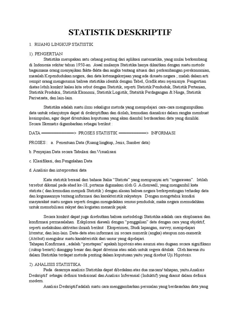 Statistika deskriptif berkaitan dengan penerapan metode statistik mengenai pengumpulan, pengolahan, dan penyajian suatu gugus data sehingga bisa memberikan . Ruang lingkup bahasan statistika inferensial. Ruang lingkup statistik deskriptif antara lain yaitu penyajian data, pengukuran tendensi sentral, pengukuran variabilitas. Berikut ini beberapa ruang lingkup bahasan statistika deskriptif, kecuali. Statistik dan statistika, statistik deskriptif dan statistik inferensial, penyajian data,.